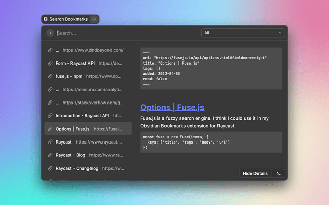 Obsidian Bookmarks lets you use Raycast and Obsidian as a place to manage your bookmarks.