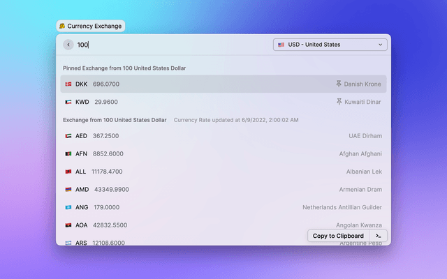 There's a currency exchange function out of box in Raycast's Calculator.